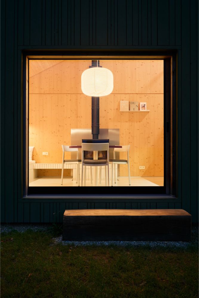 Nosnou konstrukci tvoří smrkový skeletový systém 2 × 4, opláštěný biodeskou. Interiér je založen na kombinaci měkkého dřeva, nerezových prvků a precizního detailu. Kuchyňská linka i lenoška u kamen jsou navrženy jako vestavby, které se nesnaží dominovat prostoru, ale spíše ho podporují svou přítomností.