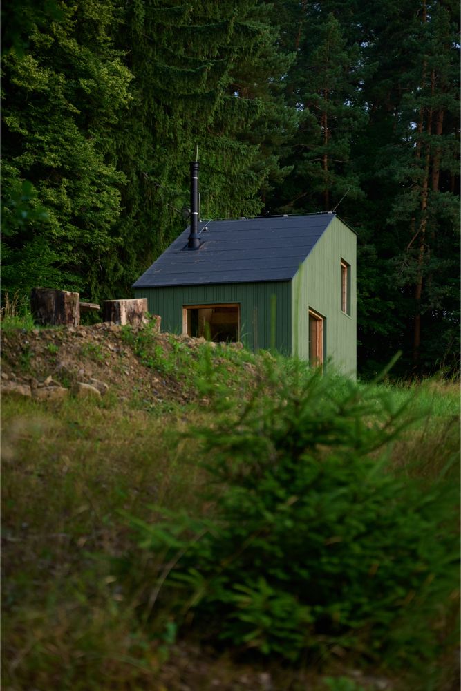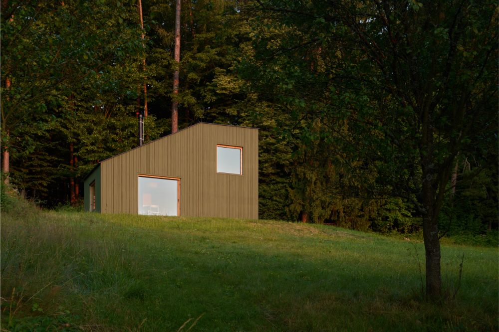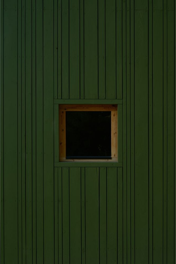 Fasáda ze svisle kladených smrkových prken natřených barvou evokuje omšelou zelenou, která se ve zdejší krajině ztrácí i vyniká zároveň.