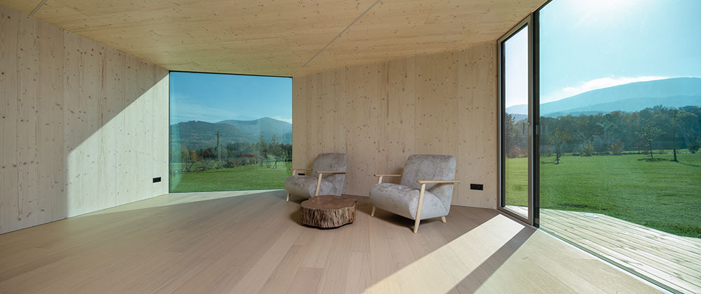 Byla realizována jednoduchá stavba s dřevěnou fošinkovou konstrukcí na zemních vrutech. Dřevostavba s tepelnou izolací, s dřevěným obkladem v interiéru a hliníkovými okny je na střeše doplněna fotovoltaickými panely. Na fasádu jsme použili plechový materiál zrcadlového efektu tak, aby se objekt ztrácel v krajině, v zahradě.