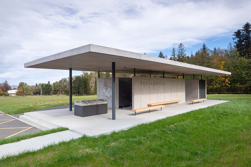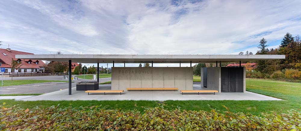 Obec Trojanovice vybudovala parkoviště pro velký zájem turistů na Pustevnách. Součástí projektu byl návrh sociálního zázemí. Uvnitř objektu se nacházejí veřejné toalety, technická místnost, posezení pod střechou, zázemí pro karavan auta a model území včetně základních informací.