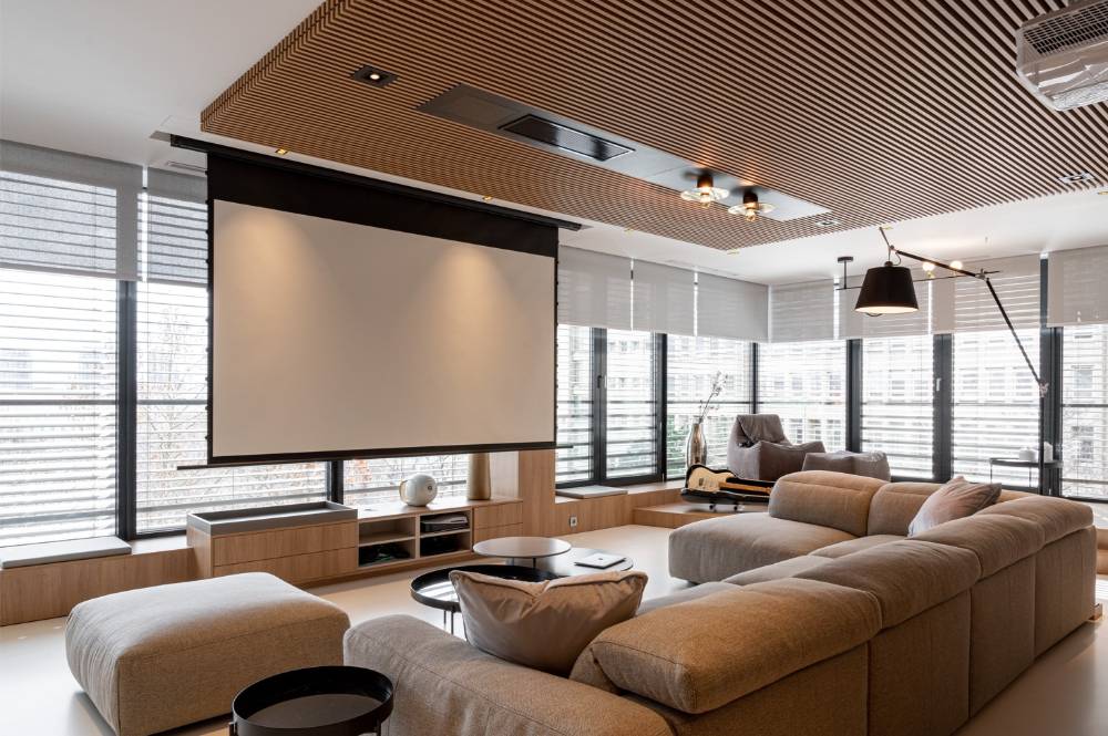 Obývací pokoj byl navržen jako multifunkční prostor s promítacím projektorem a prostorem pro klavír