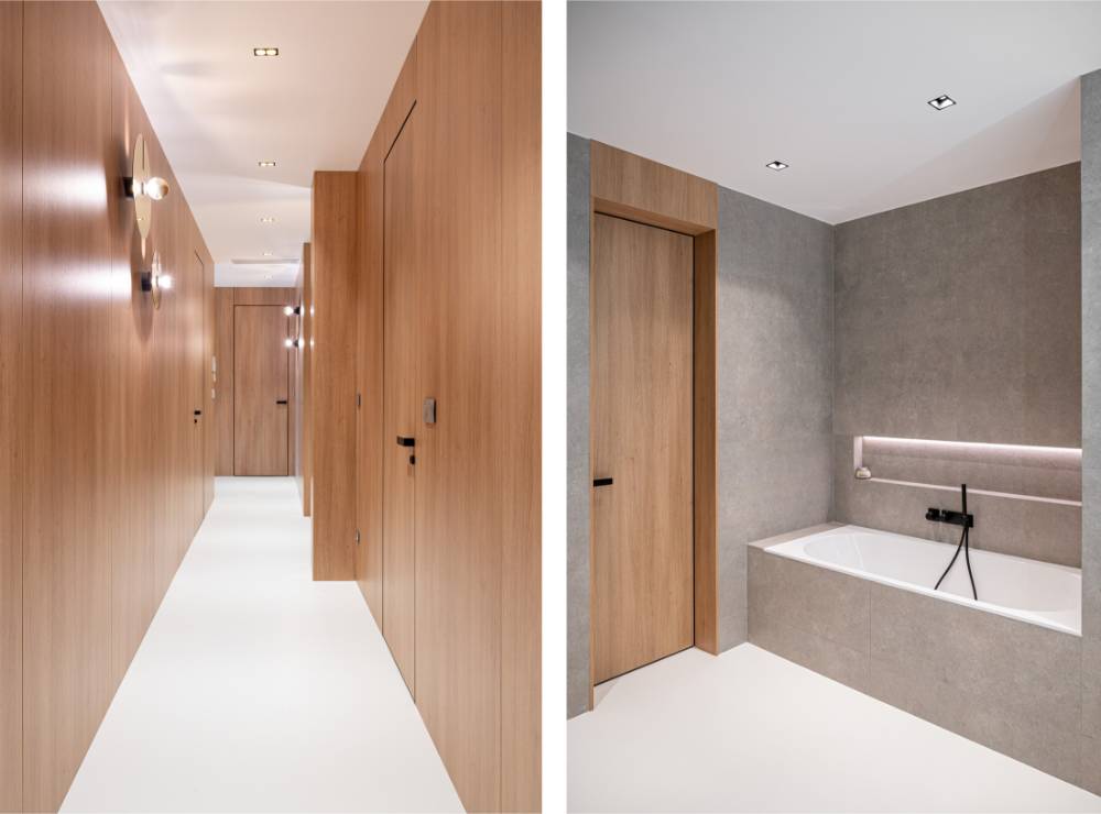 „Minimalistické pojetí interiéru se výrazně prosadilo ve všech místnostech, zejména pak v členité chodbě“, poznamenává jeden ze spoluzakladatelů ateliéru SAGA, pan Andrej Gajdoš a pokračuje: „Použili jsme sofistikovaný obkladový systém EFEKTA od firmy JAP FUTURE, který umožnil opláštění stěn ve dřevěném dekoru a zároveň včlenění dveří s nadstandardní výškou a stejným dekorem. Dveře MASTER ve skryté zárubni tak lícují s obkladem a vytvářejí čistou rovinu“.