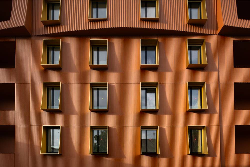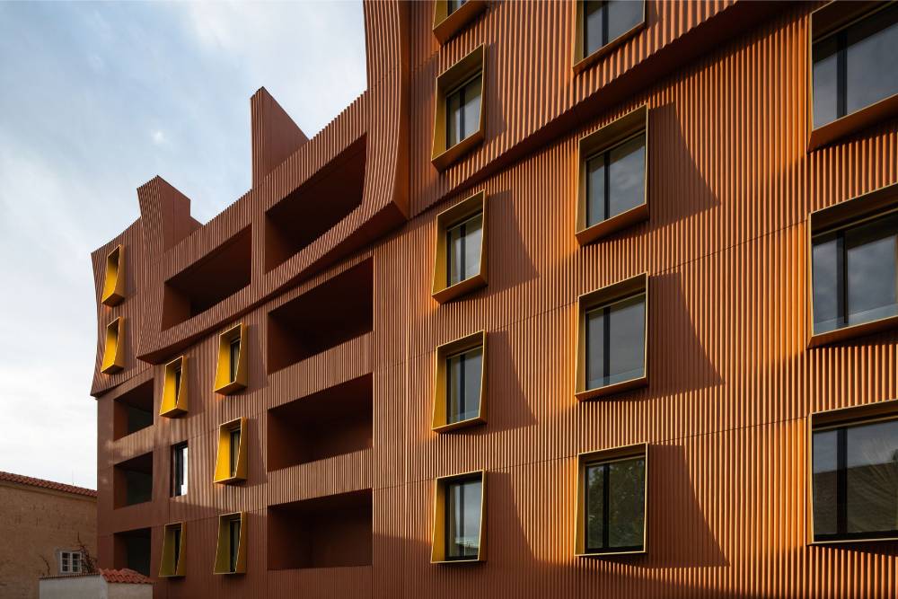 Celkové členění objektu požadované památkáři bylo vertikální dle původní parcelace. Horizontální členění odpovídá tradičnímu dělení na parter, dolní část domu a střešní krajinu. Takto „prořezaný“ dům vyvolává dojem menších hmot, podobně jako prádlo visící na šňůrách historického dvorku. Pravidelné osazení fasád stejnými okny a lodžiemi toto působení ještě posiluje. Vlnění se pak přenáší do tvaru okenních ostění a textilních screenových rolet.