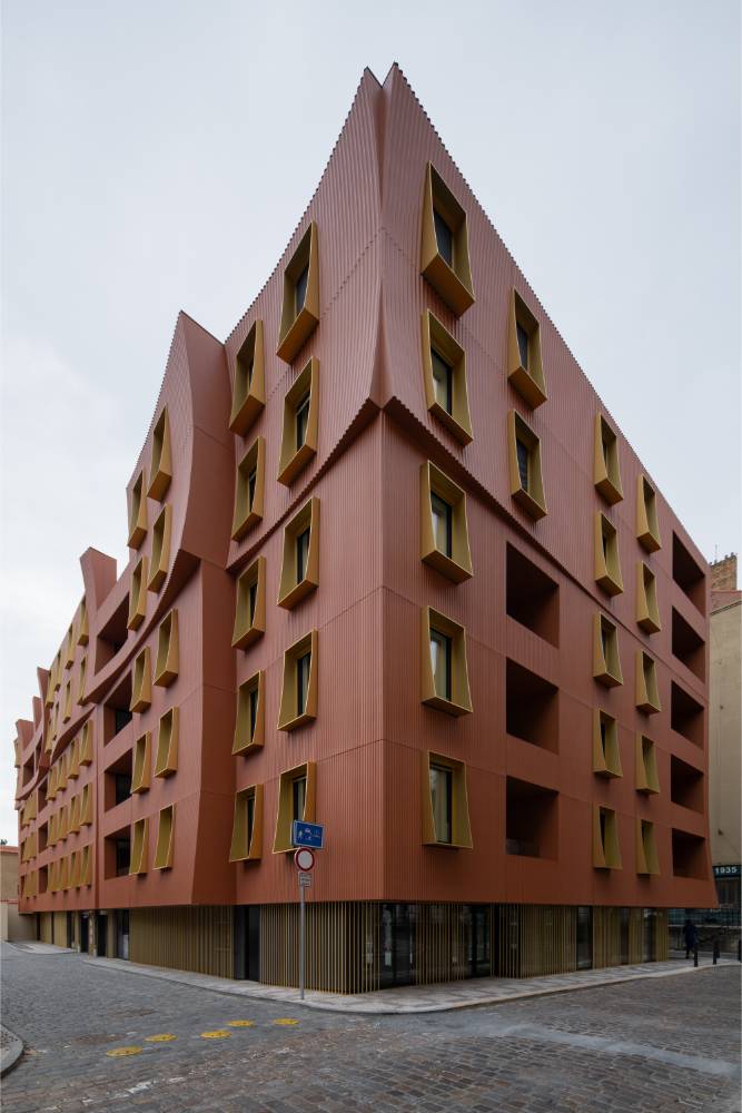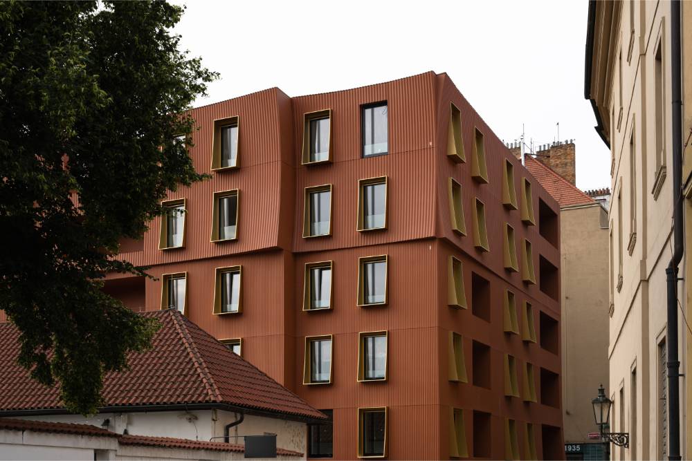 Stavební pozemek je tvořen řadou úzkých parcel po předchozí zástavbě. Tato stísněnost původních gotických domů je promítnuta i do řešení fasády nového objektu, který se svou architekturou snaží přiblížit pražským reáliím reflexí ducha Prahy i lokální inspirací z okolí. Inspirace textilem a tkaninami z pražské historie je patrná ve výrazu budovy i detailech. Jde o zvlněné fasády důsledně metricky členěné vroubkováním. Tato textilní tematika byla v Praze vždy součástí historie, v soudobé architektuře je nepřipomenuta a čeká na své znovuobjevení.