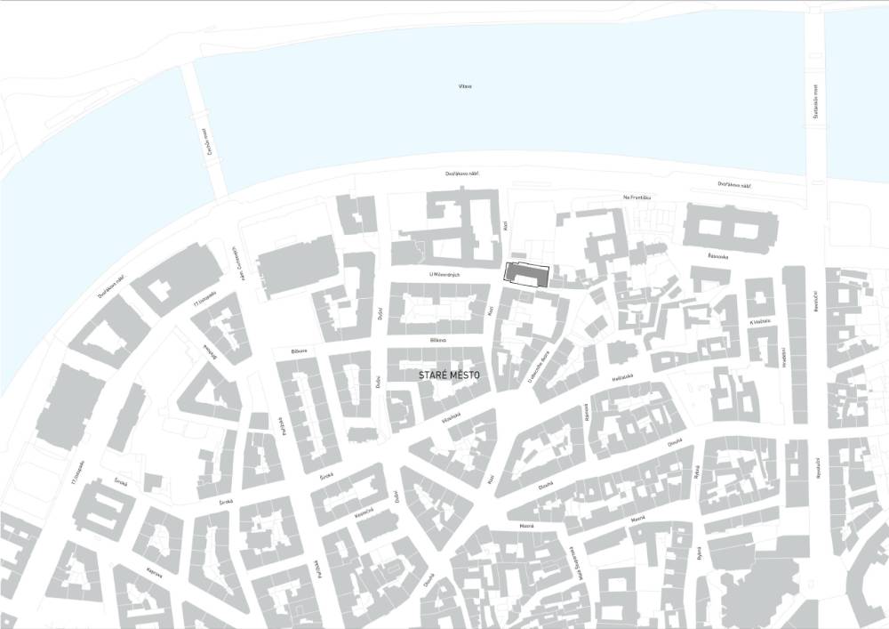 Dům se nachází v historickém centru Prahy, mezi Anežským klášterem a Nemocnicí Na Františku a doplňuje chybějící nároží křížení ulic Kozí a U Milosrdných. Stavba má tvar písmene U a vytváří malé vstupní nádvoří z ulice U Milosrdných. Objemem se nevymyká z kontextu okolní zástavby, nezakládá novou výškovou hladinu, vyrovnává se s okolní heterogenní zástavbou a není porušením prostorových vztahů – je nižší než barokní budova kláštera i asanační zástavba.