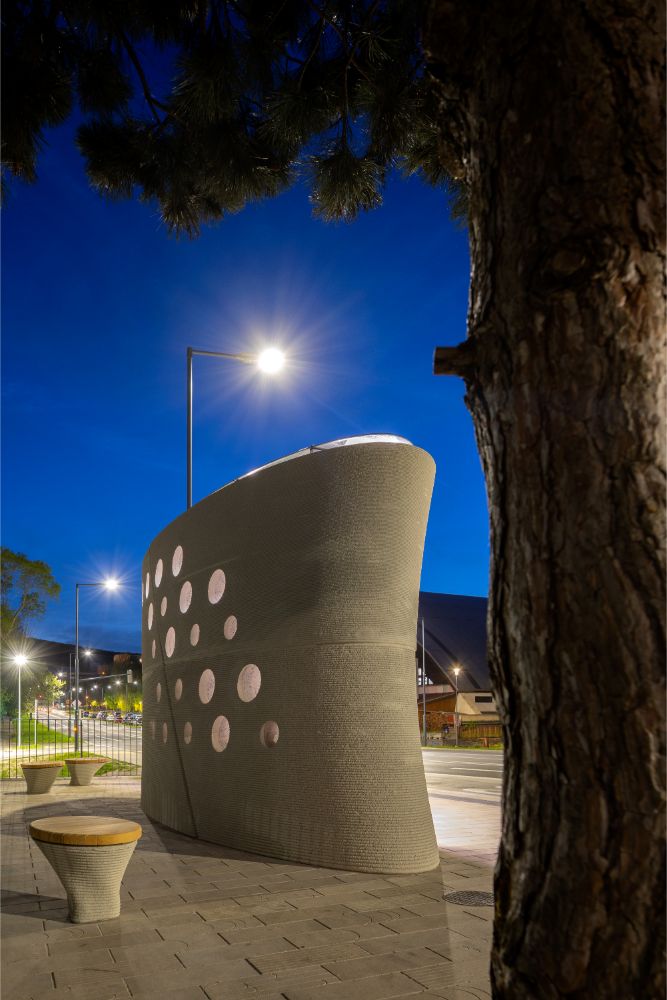 Náš návrh – parametricky generovaná betonová skořepina vytvořená pomocí 3D-tisku – se elegantně přizpůsobuje svému městskému kontextu. Orientace eliptického válce přesně reaguje na pohyb chodců a výhledové osy, maximalizuje viditelnost přijíždějících autobusů a současně chrání cestující před nepřízní počasí. Jemný náklon směrem k západu chytře snižuje expozici intenzivnímu odpolednímu slunci a převládajícím větrům, zatímco perforace na jihovýchodní straně zvyšují transparentnost a bezpečnost prostoru.