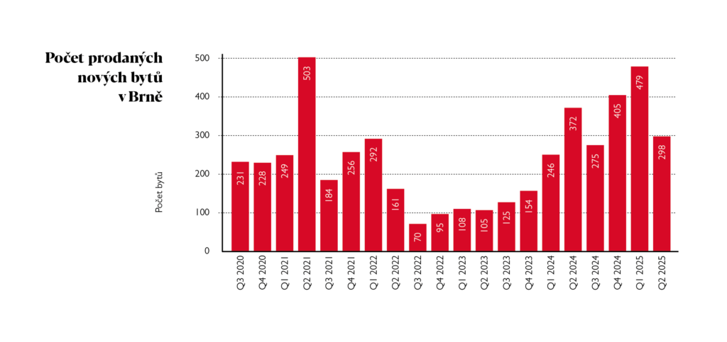 Ve druhém čtvrtletí roku 2025 se v Brně prodalo 298 nových bytů, což představuje pokles o 38 procent oproti velmi silnému prvnímu kvartálu. I přesto celkový pololetní výsledek 777 prodaných bytů překonal loňské pololetí o bezmála 160 jednotek.
