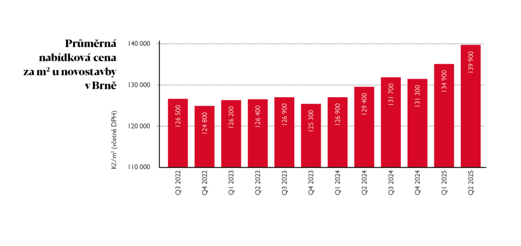 Průměrná nabídková cena nových bytů v Brně v průběhu druhého čtvrtletí postupně rostla. V dubnu byla na úrovni 138 300 Kč za metr čtvereční, následně v květnu poprvé přesáhla hodnotu 140 tisíc, když se dostala na 140 300 Kč, a v červnu se nakonec vyšplhala až na 141 000 Kč za čtvereční metr. Průměrná kvartální hodnota tak vystoupala na 139 900 Kč za metr čtvereční, čímž překonala všechny dosavadní rekordy od roku 2013, kdy společnost Trikaya začala realitní trh monitorovat.