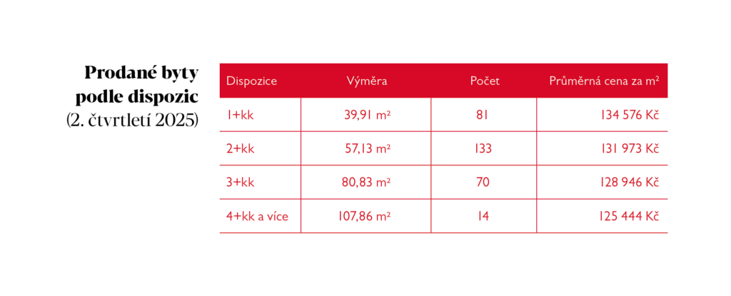 Aktivita trhu byla ve druhé polovině letošního roku značně nerovnoměrná. Zatímco duben přinesl 85 prodaných bytů a stal se nejslabším měsícem roku, červen přinesl částečné oživení se 112 prodanými byty. Po výjimečně silném začátku roku přišlo očekávané zvolnění. Na jaře se do prodejů promítly nejen přetrvávající vysoké hypoteční sazby, ale také tradičně slabší nabídka projektů. Zároveň mnoho klientů realizovalo své nákupy už v prvním čtvrtletí, kdy reagovali na odloženou poptávku z konce loňského roku.