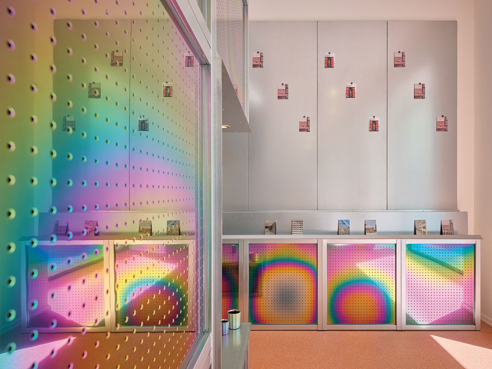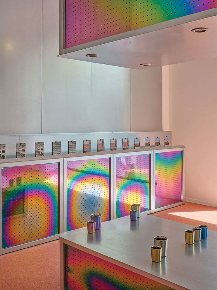 Kompaktní vnitřní prostor je organizován kolem centrálního, sochařsky pojatého prvku, který propojuje všechny funkce – recepci, zázemí, prodejní a výstavní plochy i sklad. Tento objekt prostor nejen definuje, ale také usměrňuje jeho využití pomocí jemných změn tvaru a materiálu. Snížené části slouží jako pracovní místa pro personál i návštěvníky, zapuštěné niky pro prezentaci lokálních produktů a publikací a hlubší objemy ukrývají skladovací prostory. Otevřené průchody podporují plynulý pohyb. Duhové panely rozptylují denní světlo po okolních plochách a vytvářejí proměnlivé barevné přechody, které se mění v čase.