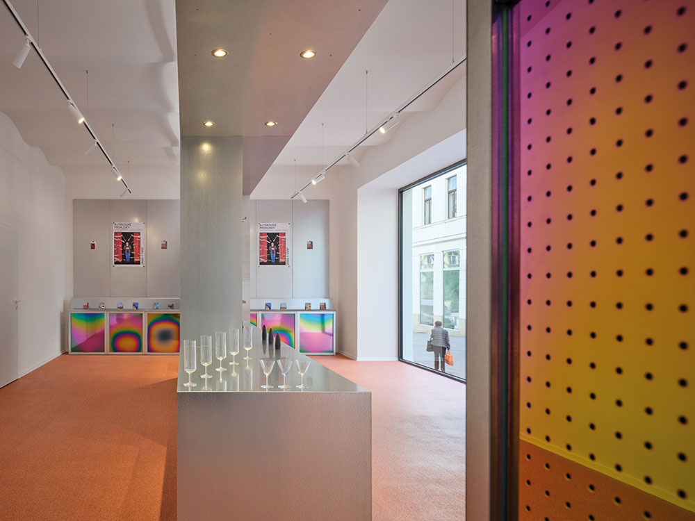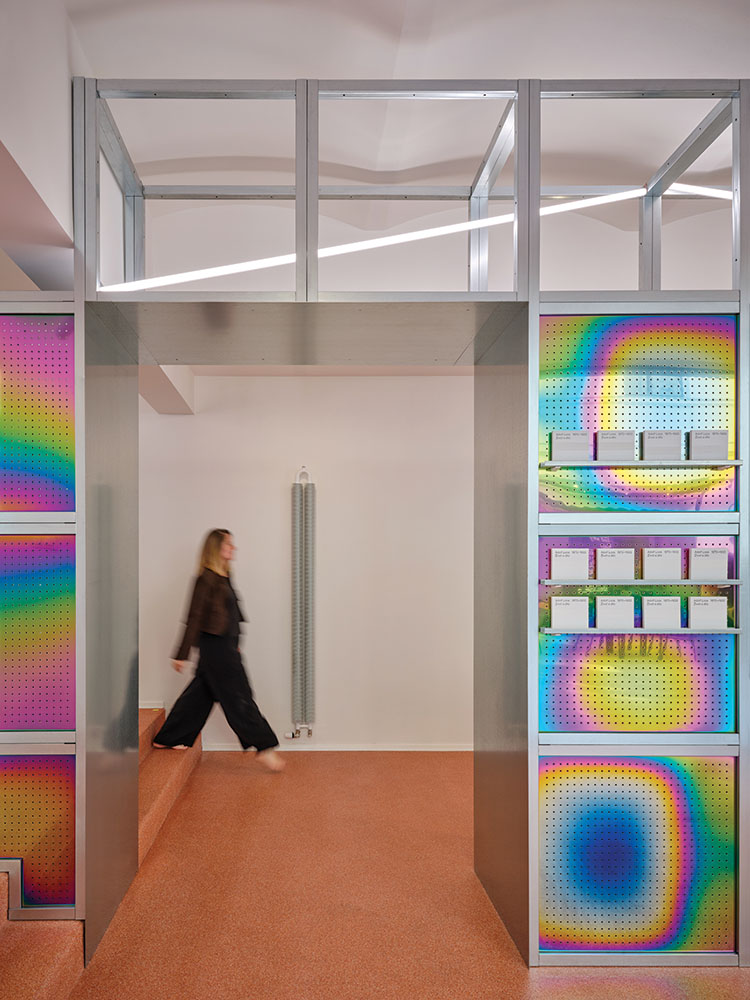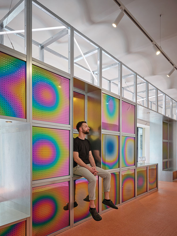 Unikátní nábytkový prvek vznikl ve spolupráci s brněnskou dílnou DURO Design, specializovanou na zakázkovou kovovýrobu s přesahem do designu. Téměř roční fáze prototypování vedla ke konečné povrchové úpravě: nitridu titanu nanesenému metodou fyzikální depozice z plynné fáze tak zvané PVD – Physical Vapor Deposition. Při tomto procesu se materiál ve vakuu odpařuje a ve spojení s atmosférickými plyny vytváří na povrchu panelů tenkou a mimořádně odolnou vrstvu. Každý panel získal charakteristický irizující efekt – jemně duhový lesk, který se mění podle světla, úhlu pohledu i samotného způsobu nanášení. Dílna DURO navrhla také vlastní spojovací systém, umožňující bezespárovou montáž podtrhující monolitický charakter celku. Tento přístup založený na spojení průmyslových metod, řemesla a experimentu odráží technické know-how s důrazem na čistotu materiálu.