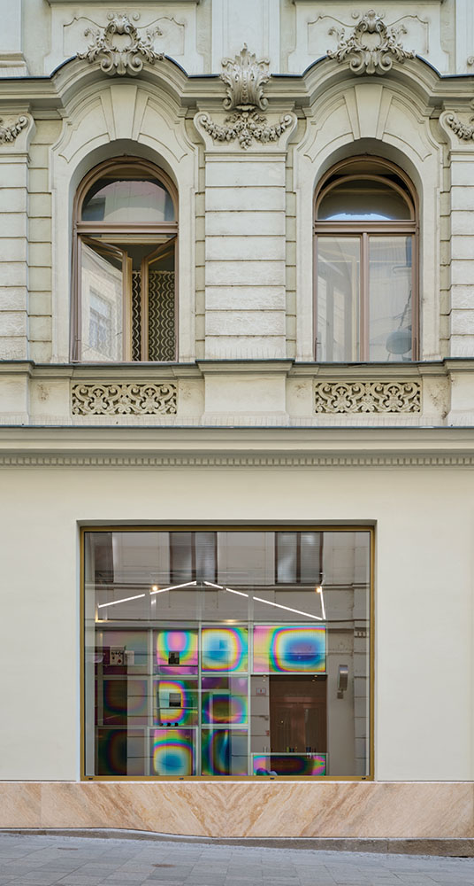 Fasáda je posazena na soklu z travertinu, jehož struktura odpovídá tradiční materialitě města Brna a je spojnicí historie se současností. V kontrastu k soklu působí předsazená kapotáž. Ta sjednocuje výraz parteru, zvyšuje jeho transparentnost a opticky rozšiřuje uliční prostor, který se tak stává kulisou pro další městské dění.