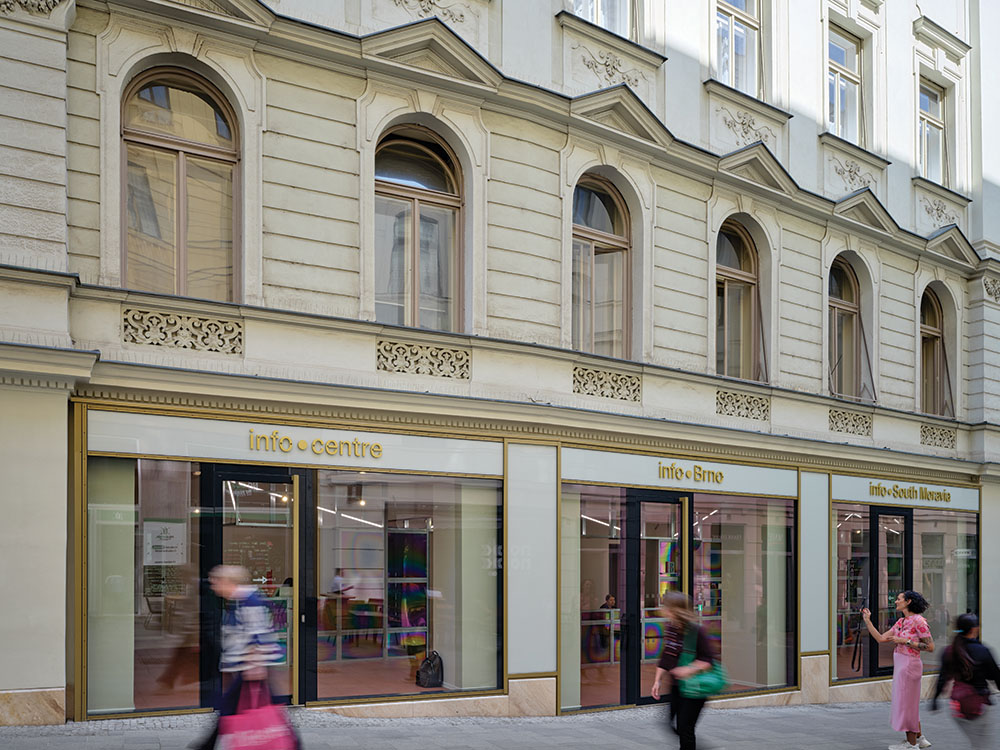 Návrh interiéru v památkově chráněném objektu od počátku hledal rovnováhu mezi uchováním historické podoby a novým aktivním využitím. Nové architektonické zásahy respektují původní rytmus budovy, kterou v minulosti ovlivnil jak svažitý terén, tak řada nahodilých úprav. Nově vytvořené otvory ve fasádě navazují na původní tektoniku stavby. A odstranění parapetů fyzicky i vizuálně propojilo infocentrum s pulzujícím veřejným prostorem. Lehce předsazené zasklení sjednocuje označení provozů, zlepšuje přístupnost a přispívá k celkové kultivaci fasády. Řešení vzniklo ve spolupráci s Národním památkovým ústavem a Odborem památkové péče města Brna. Umístění značení vychází z Manuálu dobré praxe reklamy a označování provozoven (Brno-střed, 2018, Veronika Rút). V centru města, kde často převládá vizuální smog a nahodilé výlohy, přináší tento přístup uměřenost a srozumitelnost jako nástroj kultivace městského prostoru.