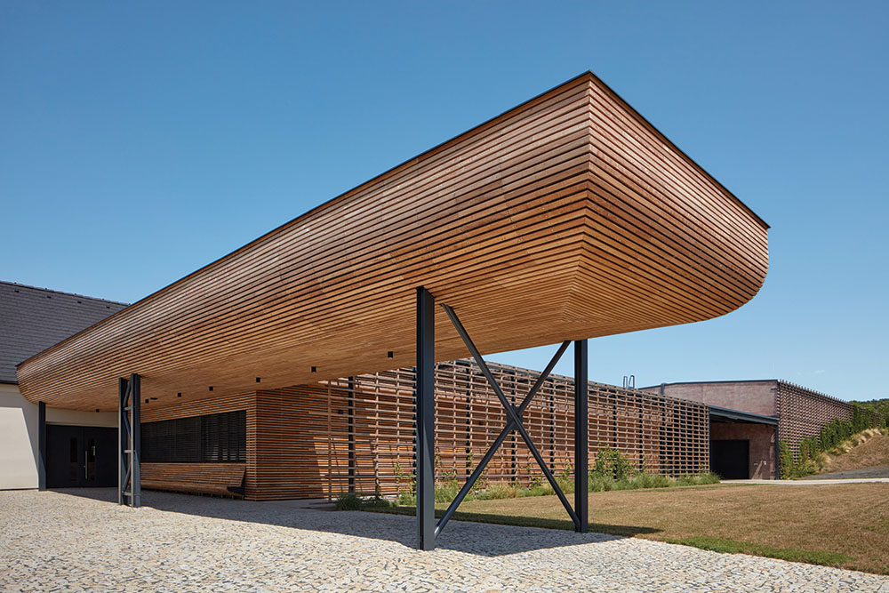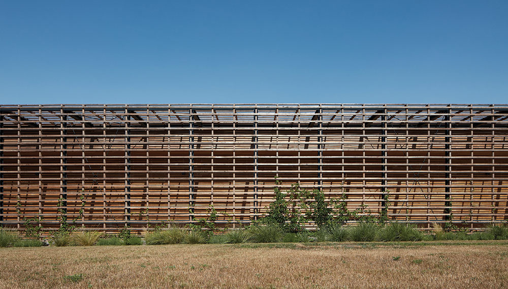 Zásadním rozhodnutím proto bylo zahalit jednotlivé přístavby do předsazené fasády z akátových latí. Fasáda má dvě úrovně – vnější řídká treláž, která slouží jako opora pro popínavé rostliny, a vnitřní husté laťování, které se místy líně sveze, aby zformovalo lavici. V místě, kde se vrstvy překrývají, akátová treláž degustační lavici stíní. Akát z místních zdrojů autoři vybrali jako vhodnou lokální dřevinu, která díky své odolnosti zajišťuje dlouhou životnost konstrukce.