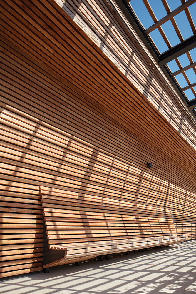 Nad prostor vybíhá výrazná konstrukce. Ta v místě již byla. Nakonec se architekti rozhodli ji zachovat a využít. Je obložena akátovými latěmi tak, aby byla zahrnuta do celku a aby bylo možné využít stínu, který toto křídlo vrhá.